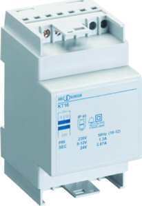 Sicherheits-Klingeltranformator Sicherheits-Klingeltransformator, nach VDE 0551 und EN 60742, für Normtragschiene, kurzschlussfest durch PTC, 100% ED, U/I-Sekundär 8-12-24V / 1,3-1,3-0,67A, Leistung 16VA, Betriebsspannung 230V 50Hz, 3 Teilungseinheiten 16 VA