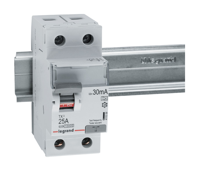 Legrand Fehlerstromschutzschalter TX3, Typ A, für Wechsel- und pulsierende Gleichfehlerströme nach VDE 0664-10, EN 61008-1, unverzögert, 2-polig, Bemessungsstrom In 25 A, Bemessungsfehlerstrom Idn 30 mA, Bemessungsspannung Un 230 VAC, Bemessungsfrequenz 50 Hz, Stoßstromfest bis 250 A, Bemessungskurzschlussstrom 10 kA bei geeigneter Vorsicherung, Befestigung auf Hutprofilschiene EN 60715 durch rastende Schnellbefestigungen, klare Information vorne auf jedem Gerät, eindeutige Schaltstellungsanzeige rot/grün am Schalthebel, mit Beschriftungsfenster, mit Untersteckschutz zum sicheren Einführen des Leiters in Fahrstuhlklemme, Anbau von Hilfsgeräten möglich.