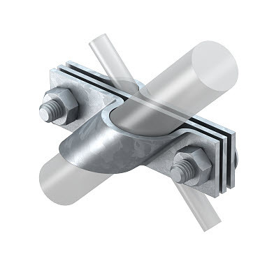 Anschlussschelle passend zum Anschluss von Tiefenerder Rd16 auf Rundleiter Rd 8-10 bzw. Flachleiter bis FL40, Mit Zwischenplatte, Montiert mit 2 Flachrundschrauben M10 x 30 und 2 Sechskantmuttern M10