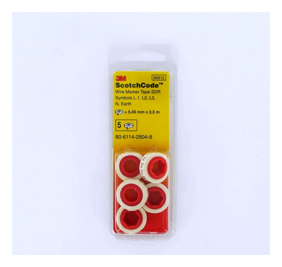 Verwenden Sie 3M ScotchCode Kabelmarkierungsband Nachfüllrolle SDR Symbole L1, L3, L3, N, Erdung, zum einfachen Kennzeichnen von Anschlussklemmen, Klemmleisten, Schalttafelverdrahtungen oder Schaltanlagen bei der Wartung oder Reparatur. Dieses dünne, anpassungsfähige Band ist in deutlichen einfach zu lesenden Zeichen mit L1, L3, L3, N, Erdung bedruckt und enthält pro Paket 5 Rollen. Dieses Polyester-Band ist gegen Markierungen, Öl, Lösungsmittel und Wasser beständig. Es ist mit 6 Zeichen pro Zoll bedruckt, wodurch es sich ideal zur Kennzeichnung von Phasen an Adern/Kabel mit großem oder kleinem Durchmesser, für Schläuche und Ersatzteile eignet.Es ist mit 3M Scotchcode STD Klebeband-Abrollern kompatiblen, wodurch es sich schnell und einfach verwenden lässt.Erfüllt die ASTM D-1000-Standardtestmethoden und ist RoHS 2011/65/EU-konform.| Hersteller / Marke | 3M |