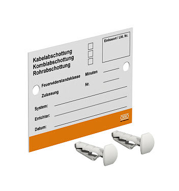 Universelles Kennzeichnungsschild zum Selbstbeschriften mit wasserfestem und lichtechtem Filzschreiber für alle OBO Abschottungen. Zur zulassungsgerechten Kennzeichnung, inkl. 2 Steckdübel.