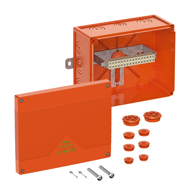 Kabelabzweig- und Verbindungskasten mit IP66 zertifiziert nach EN 60670 und IEC 62208 mit elektrischem Funktionserhalt E30-E90 nach DIN 4102 Teil 12. Halogenfreies Gehäuse aus Spezialthermoplast, Klemmen aus hochtemperaturbeständiger Spezialkeramik, Klemmenhalter frei positionierbar, Schnellmontage durch Außenbefestigungslaschen, Verbindungskasten 16-polig 0,5-2,5qmm, Abzweigkasten 16-polig 0,5-1,5qmm, Anzahl der klemmbaren Leiter pro Pol: 8 x 0,5q / 4 x 0,75q / 6 x 1q / 6 x 1,5q / 2 x 2,5q Kabelabzweig- und Verbindungskasten mit IP66 zertifiziert nach EN 60670 und IEC 62208 mit elektrischem Funktionserhalt E30 - E90 nach DIN 4102 Teil 12. Halogenfreies Gehäuse aus Spezialthermoplast, Klemmen aus hochtemperaturbeständiger Spezialkeramik Schnellmontage durch Außenbefestigungslaschen, Klemmenhalter frei positionierbar, Schutzart IP66, Funktionserhalt E30-E90, Nennquerschnitt 1,5², Schutzklasse II, Bemessungsisolationsspannung Ui 450V, Prüfzeichen VDE, Prüfzeichen UL-EU , Halogenfrei, 250 x 200 x 120, Verbindungskasten 16 polig 0,5 - 2,5 mm², Abzweigkasten 16 polig 0,5 - 1,5 mm², Anzahl der klemmbaren Leiter pro Pol: 8 x 0,5² / 4 x 0,75² / 6 x 1² / 6 x 1,5² / 2 x 2,5², Beigefügtes Zubehör: Deckelverliersicherung, Schraubanker, 2 Doppelmembranstutzen IP66 M20 Dichtbereich 7 - 12 mm, 4 Doppelmembranstutzen IP66 M25 Dichtbereich 9 - 16 mm, 2 Doppelmembranstutzen IP66 M40/4 Dichtbereich 4 x 6 - 9 mm