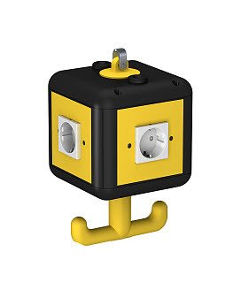 Gehäuse mit Aufhängeöse und Griffhaken und mit 4 Abdeckplatten. Bestückt wie folgt: 2 x Klemmen 3-polig, 4 x 1fach Schutzkontaktsteckdosen 16 A/250 V mit Schutz gegen Eindringen von Fremdkörpern (Kindersicherung), auf zwei Wechselstromkreise vorverdrahtet.