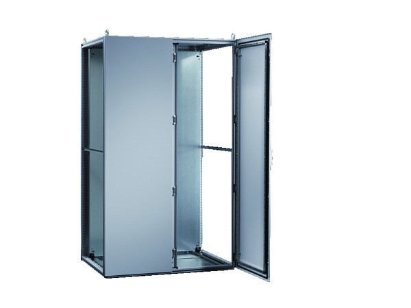 Schrankgerüst mit Türen, Montageplatte, Bodenblechen, Rückwand und Dachblech, Schlosstür rechts auf links wechselbar, Schrankgerüst, Türen, Rückwand und Dachblech mit optimalem Korrosionsschutz durch Elektropherese – Tauchgrundierung. Türen, Rückwand und Dachblech pulverbeschichtet, Montageplatte und Bodenbleche verzinkt. Farbe : RAL 7035. Schutzart: IP 55 bzw. NEMA 12