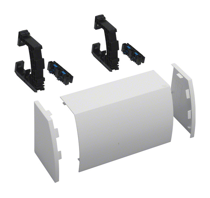 Kabelrangierkanal, 1-feldig, aufsteckbar, H x B x T176 x 300 x 135mm, RAL9010,. Elektro-Installationskanal-System Rangierkanal-Set RK aus Kunststoff, als Übergang zwischen verlegten Leitungen oder Installationskanälen und Verteilerschränke. Rangierkanal Set bestehend aus Kanalprofil mit Sollbruchstellen zum Ausklinken für Installationskanäle für Tiefe 40, 50 und 60 mm. Steckbare und verschiebbare Profilhaltern mit Putzausgleich, mit Rastnasen für Verteilerschränke IP44/55 mit Tiefe 150 und 205 mm. Zwei Profilhalter für Schränke bis Feldbreite 800 mm sowie drei Profilhaltern bis Feldbreite 1300 mm. Aufsteckbare Endkappen für links und rechts sind zu verschließen.