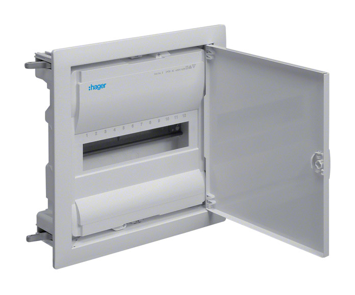 Kleinverteiler,volta,HWV,1x12PLE,IP30,mit Tür. Installationskleinverteiler Hohlwand aus Kunststoff, nach DIN VDE 60670-24 und DIN 43871, geeignet zum Einsatz in Wohngebäuden nach DIN 18015. Zum Einbau von Geräten bis 63 A mit 70 mm Einbautiefe nach Maßnorm DIN 43880, Bemessungsspannung 400V/50Hz. Schutzart IP30, Schutzklasse II schutzisoliert. Bestehend aus: Kunststoff-Mauerkasten mit serienmäßigem Leitungsabfang und ausbrechbaren Leitungseinführungsschiebern mit Schnappbefestigung sowie integrierter Wasserwaage. Hohlwandbefestigung mit Schnellfixierungshebel, seitlich oder oben/unten montierbar. Geräteträger aus verzinktem Stahlblech, Hutschienen einzeln isoliert einbaubar. Geräteabdeckung aus Kunststoff mit 46 mm Geräteschlitz, Schnellverschlussbefestigung mit 90° Drehung, serienmäßig plombierbar. Verdrehbarer Blendrahmen mit Tür aus Stahlblech, pulverbeschichtet und eingebrannt, mit 15 mm Putzausgleich. Tür, frontbündig mit innenliegenden handbedienbaren Scharnieren. Türverschluss mit frontbündiger Griffmulde und selbsttätig zurückklappendem Griff, Türanschlag rechts oder links ohne Blendrahmendemontage.| Hersteller / Marke | HAGER |