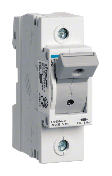 Lasttrennschalter mit Sicherungen D02 63A AC400 V 1polig Hutschiene. D0-Sicherungslasttrennschalter einpolig schaltbar für D02 Sicherungen, für Hutschienenmontage. Mit Meldesystem für Sicherungsausfall durch LED. Schraubkappenlose Stecktechnik bietet werksseitigen dauerhaften Kontaktdruck. Keine Kontaktlockerung während des Betriebes. Abschließbar mit Vorhängeschloss und plombierbar. Entnehmbarer Sicherungsstecker mit Fingerschutz. Entspricht der Gerätenorm IEC 60947-3.| Hersteller / Marke | HAGER |