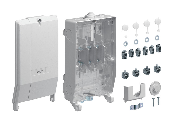 Hausanschlusskasten, KH00, Baureihe K3, 1x3NH00, Polyesterdeckel. Hausanschlusskasten nach DIN 43627 und DIN VDE 0660-505, Schutzart IP 54, Gehäuse aus glasfaserverstärktes Polyester. Plombierbares Gehäuse mit Kabel-Einführungen, Gehäusedeckel in 15 Grad-Stellung aushängbar. Als Einbauten dient ein NH-Sicherungsunterteil mit Berührungsschutzabdeckung.| Hersteller / Marke | HAGER |