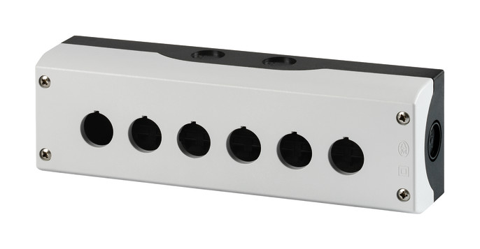 Aufbaugehäuse, Gehäuse: Kunststoff, mit Edelstahlschrauben, Einbaustellen: 6, Leitungseinführung: rückseitig: 2 x M20, oben: 2 x M20, seitlich: 2 x M20/M25 (je Seite 1 x), Schutzart: IP66, Farbe RAL-Wert: RAL 7035, Farbe: Gehäuseunterteil anthrazit, Anbindung an SmartWire-DT: nein, verwendbar für: (Leucht)-Drucktasten, (Leucht)-Wahltasten, Schlüsseltasten, Leuchtmelder, NOT-HALT-/NOT-AUS-Tasten mit gelbem Schild
