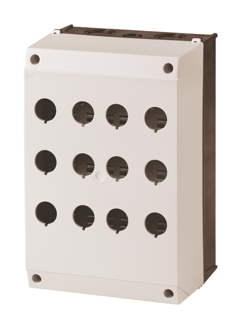 Aufbaugehäuse, Gehäuse: Kunststoff, mit Edelstahlschrauben, Einbaustellen: 12, Schutzart: IP66, Farbe RAL-Wert: RAL 7035, Farbe: Gehäuseunterteil anthrazit, Anbindung an SmartWire-DT: nein, verwendbar für: 12 x 22,5, verwendbar für: (Leucht)-Drucktasten, (Leucht)-Wahltasten, Schlüsseltasten, Leuchtmelder, NOT-HALT-/NOT-AUS-Tasten mit gelbem Schild