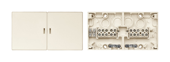 2 bruchgeschützte Deckel mit Schnappverschluss, 3 herausnehmbare Klemmsteine mit 12 Doppelklemmen. Große, übersehbare Anschlussräume. Schraub- und Krallenbefestigung für 60er- und 70er-UP-Dosen (Mauerwerk, Hohlwand- und Betonbau), mit abnehmbaren Spreizkrallen. Dübelbefestigung ebenfalls möglich. Farbe: weiß.