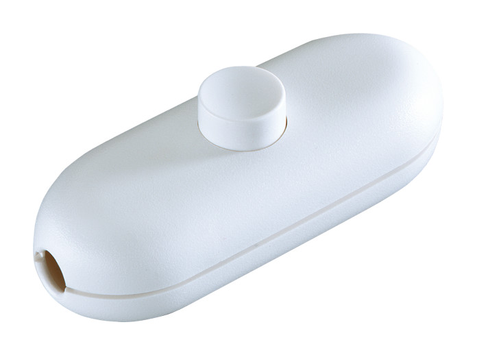 Schnur-Zwischenschalter Serie 5044, 1polig, Gehäuse: weiß / Knopf: weiß 2(1)A 250 V Ausschalter, 1polig Gehäuse und Zugentlastung geschraubt, 2 Verbindungsklemmen für 2- und 3-adrige Kabel.