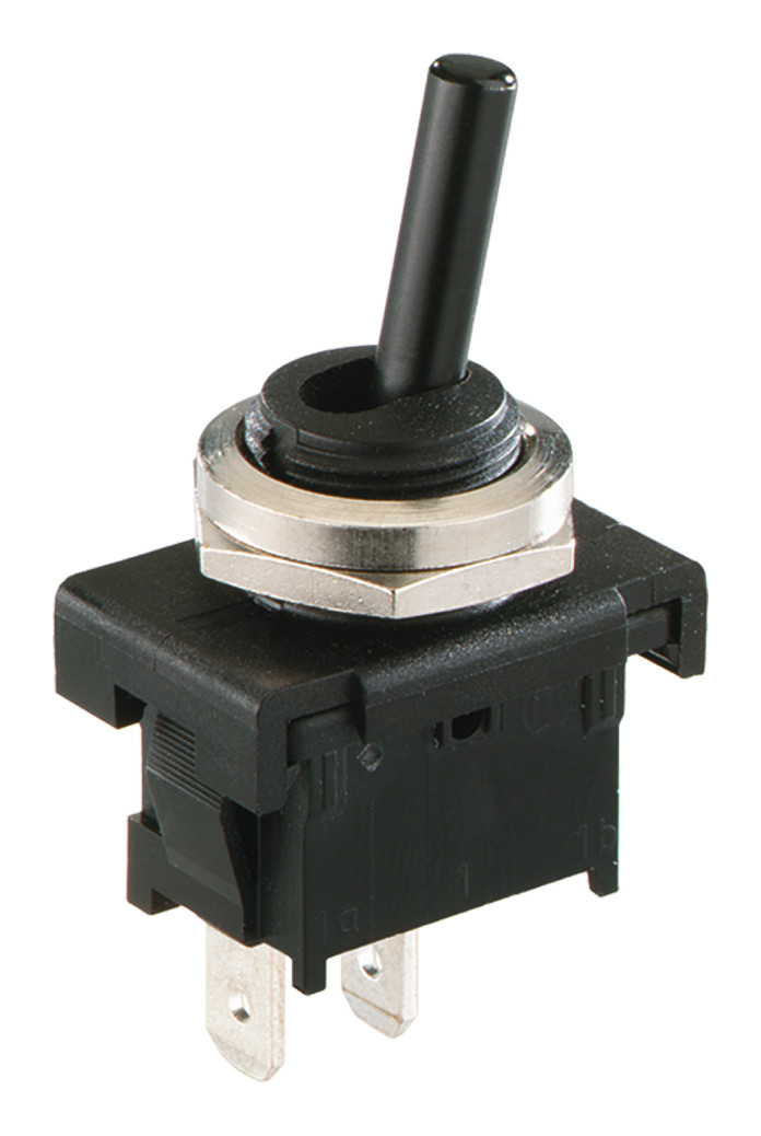 Kippschalter Serie 8400 6(4) A 250V Ausschalter, 1polig, Steckanschluss 4,8mm Geeignet für Geräte der Schutzklasse II, Zentralbefestigung M 12x0,75mm, Sechskant- und Rädelmutter aufgeschraubt, Kipphebel und Gehäuse aus Thermoplast, Kontake aus Silber, Anschlüsse versilbert, geeignet zum sek. schalten von Halogenleuchten