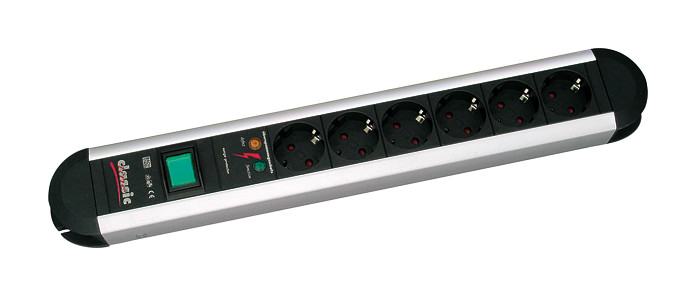 Tischsteckdose PRIMO-CLASSIC-ALU 6-fach mit Überspannungsschutz + Schalter, 2m HO5VV-F 3G1,5mm² schwarz, in Kartonbox