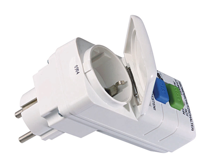 Fehlerstrom Schutzadapter weiß mit Klappdeckel - IP 44 < 30mA Auslösestrom < 30ms Auslösezeit max. 3600W 16A 250V 50Hz| Hersteller / Marke | BACHMANN |
