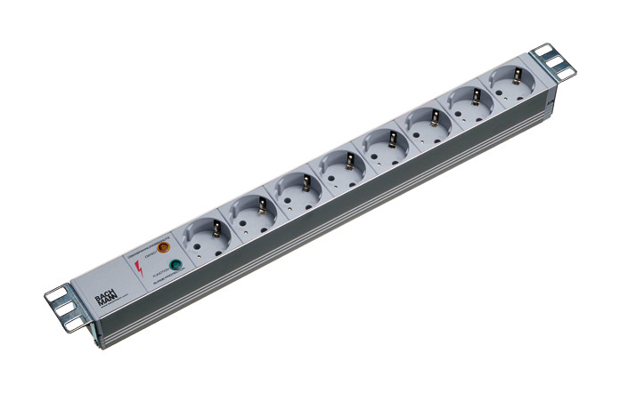 19'' 1HE ALU Steckdosenleiste 8x Schutzkontakt RAL 7035 mit Überspannungsschutz 6,5kA ( ÜSS ); Profil: ALU 1HE Länge:438,5mm; Endstücke genietet, nicht öffenbar; 2m H05VV-F 3G1,50mm² schwarz mit Schutzkontaktwinkelstecker; inkl.Befestigungswinkel mit Schrauben; verpackt im Polybeutel