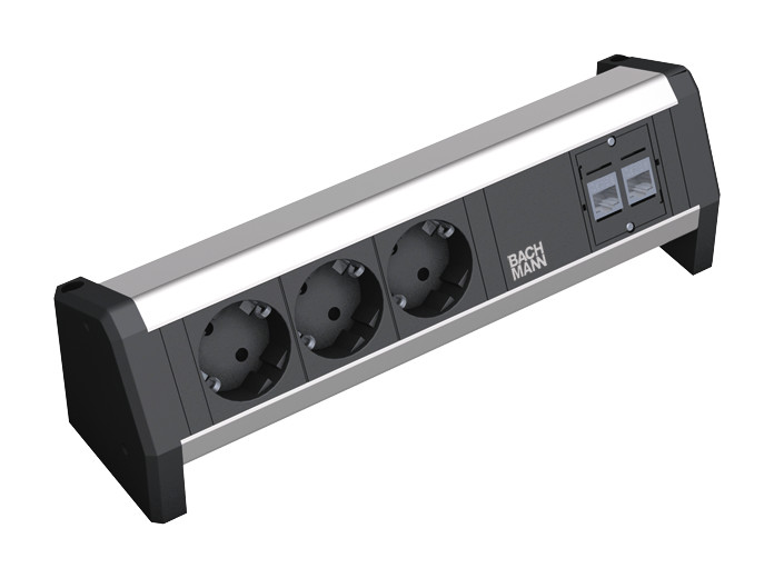 DESK ALU eloxiert 3 Schutzkontaktsteckdosen schwarz, 2xCAT6A Buchsen Stromeingang-/Ausgang GST18 - Stecker, ohne Zuleitung (separat erhältlich ), inkl. Haltewinkel und Schrauben, verpackt im Einzelkarton Desk,| Hersteller / Marke | BACHMANN |