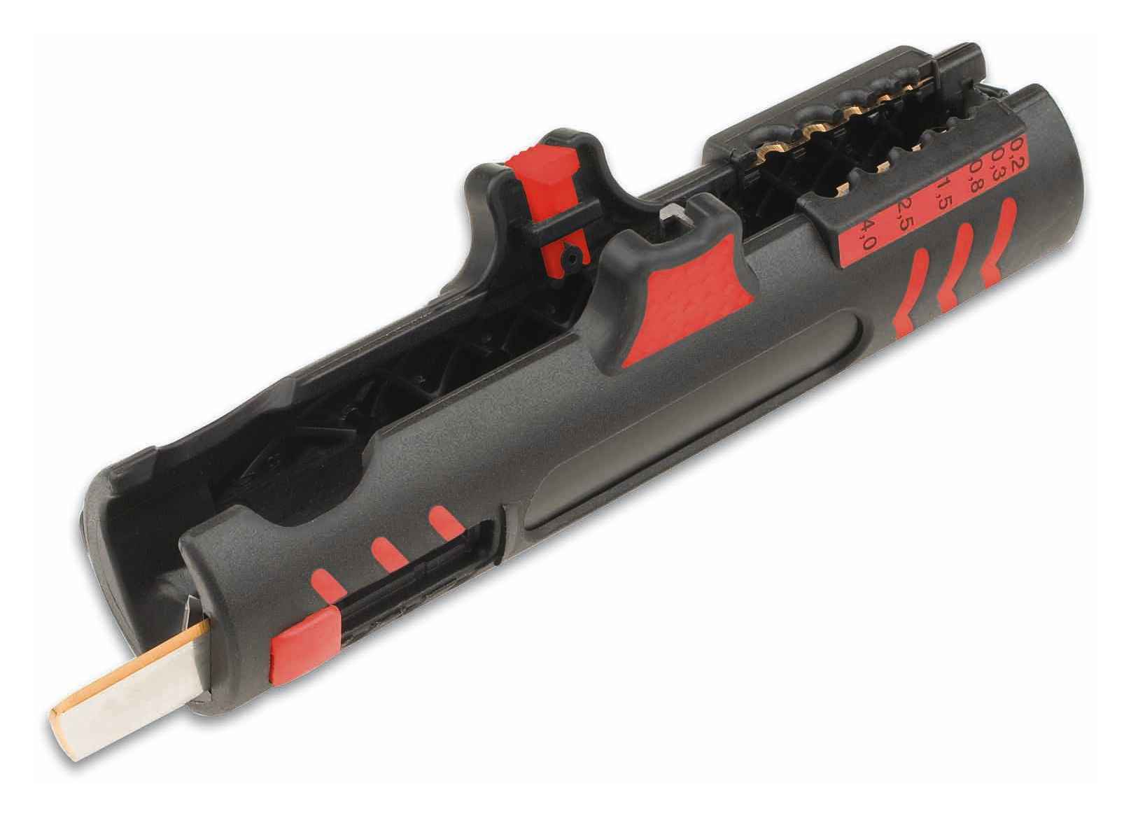 Super-Entmanteler, Sowohl die Spitzen der innenliegenden Kabelmesser wie auch die Schneiden der aufgesetzten Bügelklingen sind titannitridbeschichtet. Bei ca. 500 Grad C wird der Schneideklinge in der Vakuumkammer nach dem PVD-Verfahren Titannitrid aufgedampft. Durch die verringerte Oberflächenstruktur und die extrem hohe Härte werden hervorragende Gleiteigenschaften und eine hohe Verschleiß- bzw. Abriebfestigkeit erreicht. TiN-beschichtete Messer können mit wesentlich höherer Haltbarkeit undSchnittleistung eingesetzt werden. Mit Rund- und Längsschneider, Abisoliervorrichtung und versenkbarem Zusatzmesser, Abmanteln: Kabel von 8 - 13 mm Durchmesser, z. B. : 7 x 1, 5 qmm oder 5 x 2, 5 qmm, Abisolieren: 0, 2 – 0, 3 – 0, 8 mm Durchmesser, 1, 5 – 2, 5 – 4 qmm