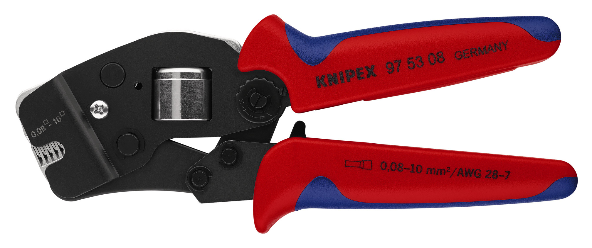 Chrom-Vanadin-Elektrostahl in Sondergüte, ölgehärtet Zum Verpressen von Aderendhülsen nach DIN 46228 Teil 1 + 4. Für lötfreie elektrische Verbindungen. Frontale Einführung der Aderendhülsen in das Werkzeug. Leichte Handhabung durch Selbsteinstellung auf die Hülsengröße. Mit Vierkant-Crimp für optimale Kontaktflächen im Klemmanschluss. Gleichbleibend hohe Crimpqualität durch Zwangssperre (entriegelbar). Crimpdruck ist werkseitig präzise eingestellt (kalibriert). Kraftverstärkung durch Hebelübersetzung für ermüdungsarmes Arbeiten. Hoher Bedienkomfort durch handliche Bauform und geringes Gewicht. Verpressung von 0,08 bis 10,0 mm² in einem Profil. Aderendhülsen bis 2,5 mm² können parallel von der Seite zugeführt werden. Insbesondere passend für alle Twin-Aderendhülsen bis 2 x 4 mm² oder 2 x AWG 10.