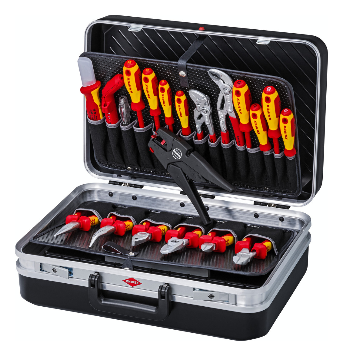 Bestückt mit 20 Markenwerkzeugen, teilweise VDE-geprüft nach DIN EN 60900. Max. Zuladung: 20 kg. 24 Liter Fassungsvermögen. Flexible Gestaltungsmöglichkeiten durch individuell unterteilbare Einsätze in der 60 mm tiefen Bodenschale und deren Abdecktafel mit sechs großen Werkzeugtaschen. Stabile Rasterscharniere halten den Deckel trotz des Eigengewichts der Werkzeuge bei Bedarf offen. Stabiler, ergonomischer Tragegriff, rastet im 90° Winkel ein. Herausnehmbare Werkzeugtafel mit 15 Werkzeugtaschen auf der Bodenseite und sechs Werkzeugtaschen sowie einem Klemmfach (400 mm breit) auf der Deckelseite, per Druckknopf gehalten. Zwei abschließbare Stahl-Kippschlösser schützen den Kofferinhalt vor Diebstahl. Umlaufender Doppel-Aluminiumrahmen. Strapazierfähige Ausführung aus ABS-Material, schwarz. Abdeck- und Werkzeugtafeln aus schmutzabweisenden PP-Hohlkammerplatten. Abmessungen, außen (B x H x T): 480 x 380 x 180 mm Abmessungen, innen (B x H x T): 460 x 310 x 170 mm.