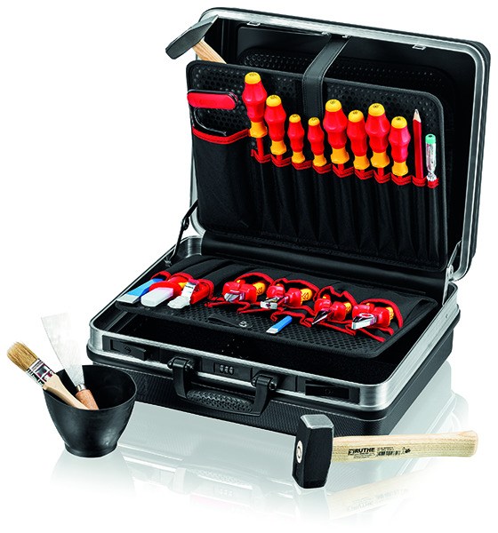 ABS-Hartschalenkoffer mit Zahlenschloss, Dokumententasche und Tragegurt. Bestückt mit: Kombizange, Abisolierzange, Flachrundzange, Seitenschneider, 2 Kabelmesser, PUK – Säge, je 1 Schraubendreher 2,5 x 80, 3,5 x 100, 5,5 x 125, 6,5 x 150. je 1 Kreuzschlitz PH 1 und PH 2 und je 1 Pozidriv PZ 1 und PZ 2. Spannungsprüfer, Maurermeißel, Elektriker-Meißel, Schlosserhammer 300 g, Fäustel 1.000 g, Zimmermannsbleistift, Malerspachtel 40 mm, Wasserpinsel und Gipsmulde 125 x 90.| Hersteller / Marke | KNIPEX |
