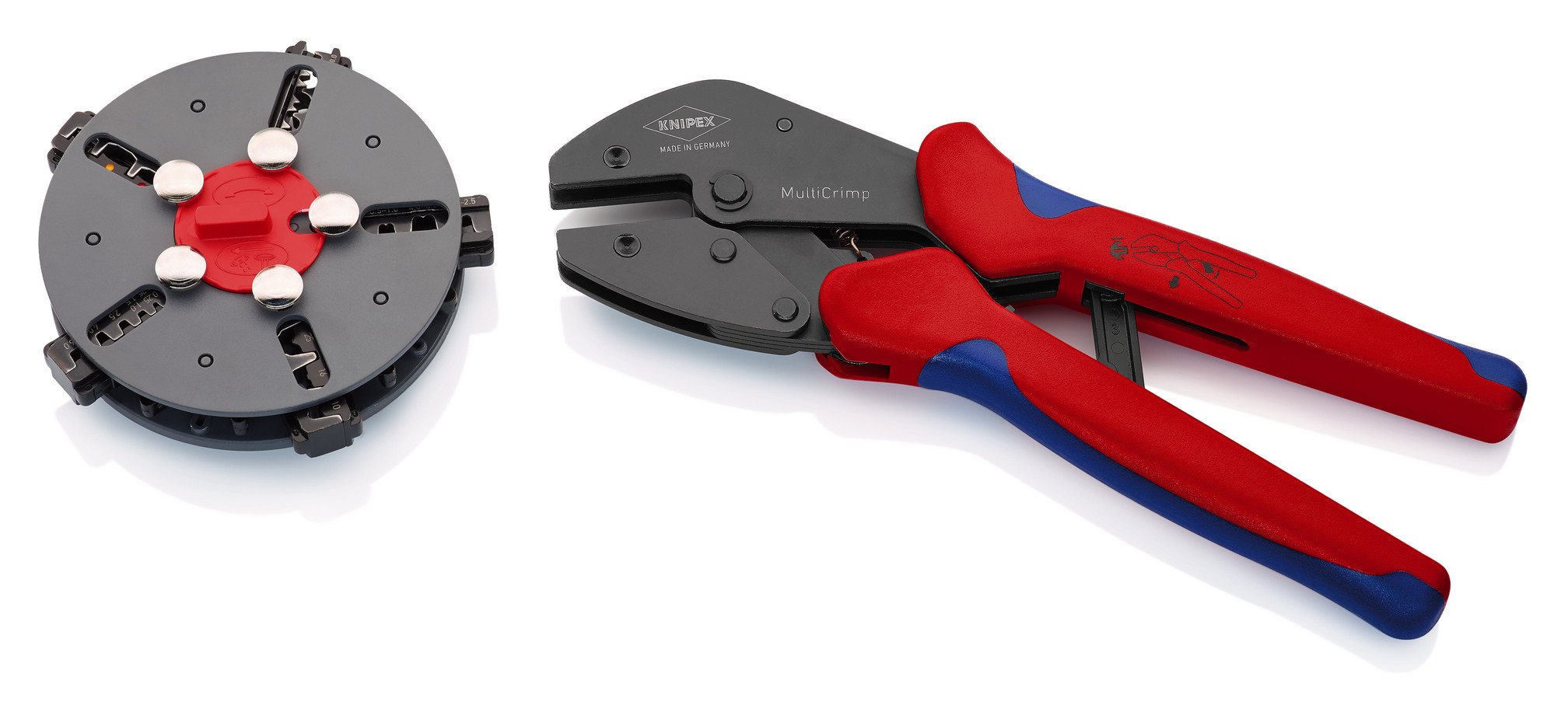 Chrom-Vanadin-Elektrostahl in Sondergüte, ölgehärtet. Rundmagazin: Kunststoff, glasfaserverstärkt. Auch für isolierte und unisolierte Aderendhülsen 10 / 16 / 25 mm². Universeller Dorncrimpeinsatz für unisolierte Verbinder. Set bestehend aus Zange und Schnellwechselmagazin für gängige Crimpanforderungen. Für lötfreie elektrische Verbindungen. Gleichbleibend hohe Crimpqualität durch Präzisionseinsätze und sehr feinstufige Zwangssperre (entriegelbar). Crimpdruck ist werkseitig präzise eingestellt (kalibriert). Ergonomisch geformte, zweifarbige Mehrkomponenten-Hüllen für Ein- und Zweihandbedienung. Sehr einfaches und schnelles Wechseln der Crimpeinsätze, ohne zusätzliches Werkzeug. Sicherer Halt der Wechseleinsätze im Werkzeug. Sichere und schmutzgeschützte Aufbewahrung der Wechseleinsätze in einem Rundmagazin. Rundmagazin mit praktischem Gürtelclip - Wechseleinsätze immer am Mann.| Hersteller / Marke | KNIPEX |