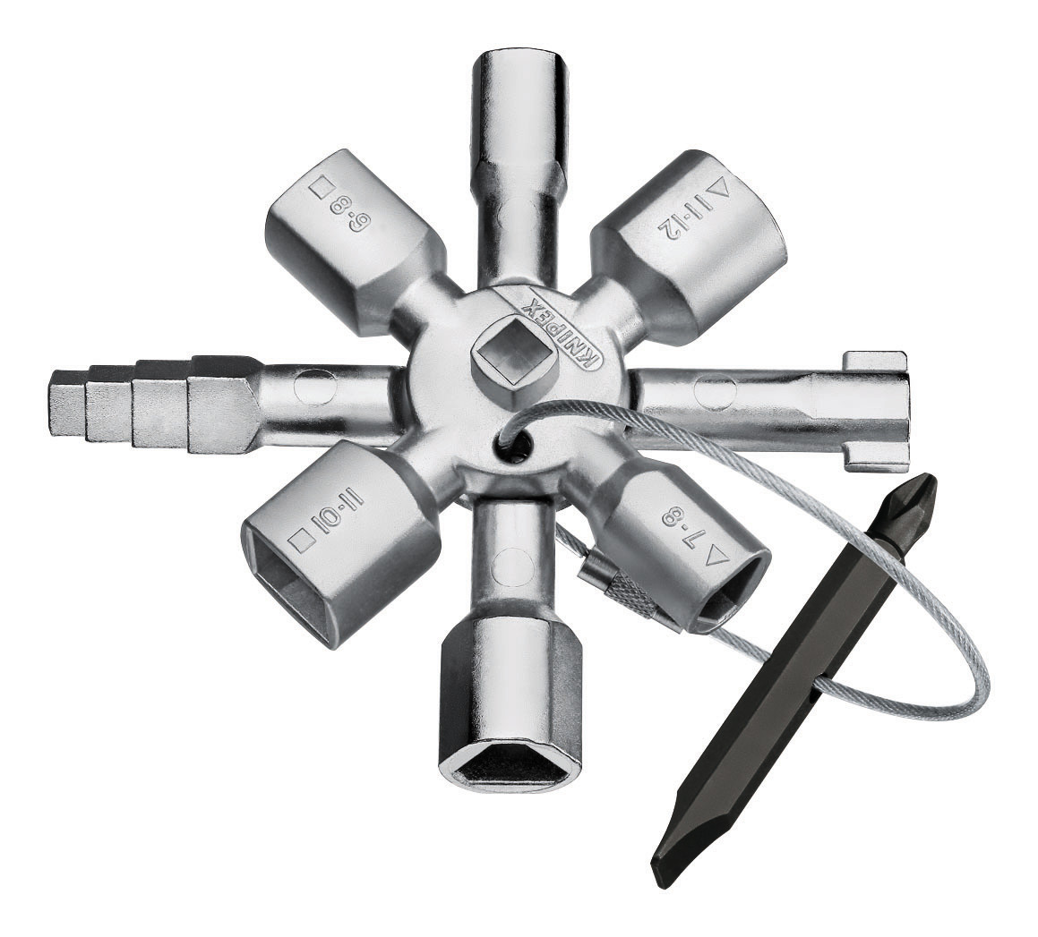 10 Profile. 2 Kreuze. 1 Schlüssel.. Alle gängigen Schließsysteme.. Multifunktionaler Schlüssel für Betätigung von Schließungen aus den Bereichen Gebäudetechnik (Heizung und Sanitär, Klima- und Belüftungstechnik, Elektrotechnik), Gas- und Wasserversorgung und Absperrsysteme. 8-strahlige Version: 2 Kreuzschlüssel mittels Magneten platzsparend verbunden. Wendebit: Schlitz 1,0 x 7 mm und Kreuzschlitz PH2. Schlüssel und Wendebit durch stabiles Edelstahl-Drahtseil verbunden. Hochwertige Oberflächenbeschichtung. Gewichtsoptimierte Zink-Druckguss Konstruktion.