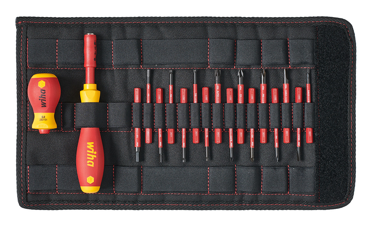 Vereinfacht Ihre Arbeit: Alle Werkzeuge sicher und geordnet in einer robusten und übersichtlichen Tasche untergebracht.Erhöht Ihre Sicherheit: Wiha slimBits gewährleisten einen guten und geschützten Zugang zu tief liegenden Schrauben.Steigert Ihre Effizienz: Platzeinsparung durch umfangreiches Wechselklingensystem.Bietet Ihnen vollen Schutz: Jedes Werkzeug einzeln bei 10.000 V AC getestet und zugelassen für 1.000 V AC.Bei Arbeiten an unterschiedlichen Einsatzorten wie z.B. auf Baustellen, an Solaranlagen und Schaltschränken werden viele verschiedene Schraubprofile benötigt. Das Schraubendreher und Bit-Set slimVario® deckt alle gängigen Schraubprofile ab und ist somit flexibel einsetzbar. Sicher verstaut und geordnet in einer robusten Tasche sind die Elektriker Werkzeuge perfekt für den mobilen Einsatz geeignet. Das 18 tlg. Werkzeugset bietet eine optimale Platzeinsparung durch ein umfangreiches Wechselbitsystem. Dank der Wiha slimTechnology können die enthaltenen slimBits mit ihrer bis zu 33% schlankeren Klinge auch tiefliegende Schraub- und Federelemente mühelos erreichen. In Kombination mit dem extra kurzen Stubby-Griff können insbesondere an Engstellen die Schrauben mühelos erreicht werden. Für tiefliegende Schrauben und bei größerer Kraftübertragung kommt der Längsgriff zum Einsatz. Jedes Werkzeug im Set wurde gemäß der internationalen Norm IEC 60900 einer Stückprüfung unterzogen und ermöglicht ein sicheres Arbeiten im Bereich von spannungsführenden Teilen bis 1.000 V AC.Normen: Geprüft gemäß IEC 60900.Anwendung: Für Arbeiten im Bereich von spannungsführenden Teilen bis 1.000 V AC. Ideal für den mobilen Einsatz und im beengten Arbeitsumfeld. 1 x Bit slimBit electric Phillips (34583) PH1 x 75 mm1 x Bit slimBit electric Phillips (34584) PH2 x 75 mm1 x Bit slimBit electric PlusMinus/Pozidriv (34589) SL/PZ1 x 75 mm1 x Bit slimBit electric PlusMinus/Pozidriv (34590) SL/PZ2 x 75 mm1 x Bit slimBit electric Pozidriv (34585) PZ1 x 75 mm1 x Bit slimBit electric Pozidriv (34586) PZ2 x 75 mm1 x Bit slimBit electric Schlitz (34578) 2,5 mm x 75 mm1 x Bit slimBit electric Schlitz (34581) 5,5 mm x 75 mm1 x Bit slimBit electric Schlitz (41159) 3,5 mm x 75 mm1 x Bit slimBit electric Sechskant (37147) 3 x 75 mm1 x Bit slimBit electric Sechskant (37225) 4 x 75 mm1 x Bit slimBit electric Sechskant (37226) 5 x 75 mm1 x Bit slimBit electric TORX® (35507) T10 x 75 mm1 x Bit slimBit electric TORX® (35508) T15 x 75 mm1 x Bit slimBit electric TORX® (35509) T20 x 75 mm1 x Bit slimBit electric TORX® (41160) T9 x 75 mm1 x Schraubendreher mit Bithalter SoftFinish® electric slimVario für slimBits (34577) 6 mm x 50 mm1 x Schraubendreher mit Bithalter SoftFinish® electric slimVario Stubby für slimBits VDE- und GS-geprüft 6