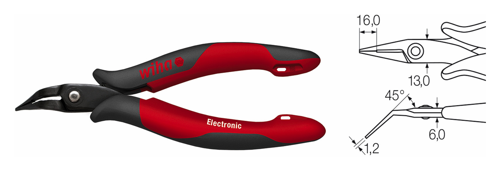 Kopfform: Schmaler, kurzer Kopf.Ausführung: Mit glatten Innenbacken.Breite an der Spitze nur 1,2 mm.Werkstoff: C 70 Sonder-Werkzeugstahl.Anwendung: Zum Halten von kleinen Teilen sowie zum Halten und Abwinkeln von Drähten.