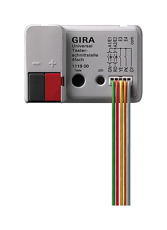KNX Universal-Tasterschnittstelle 4fach Unterputz-Binäreingänge, einsetzbar in tiefe Gerätedose (60 mm tief) hinter einem konventionellen Schalter Taster, zum Anschluss potenzialfreier Kontakte. Die Schaltvorgänge potenzialfreier Kontakte werden in KNX Telegramme umgesetzt. Die Eingänge können dabei unabhängig voneinander verschiedenen Funktionen zugeordnet oder gesperrt werden. Die Eingänge sind als Ausgänge (max. 2 mA) parametrierbar. Merkmale: - Sperrobjekt zum Sperren einzelner Eingänge. - Verhalten bei Busspannungswiederkehr für jeden Eingang separat parametrierbar. - Telegrammratenbegrenzung. - Zwei unabhängige Schaltobjekte für jeden Eingang vorhanden und einzeln freischaltbar, Befehl bei steigender und fallender Flanke unabhängig einstellbar (EIN, AUS, UM, keine Reaktion), zyklisches Senden der Schaltobjekte in Abhängigkeit der Flanke oder in Abhängigkeit des Objektwerts wählbar. - Einflächen- und Zweiflächenbedienung, Zeit zwischen Dimmen und Schalten und Dimmschrittweite einstellbar, Telegrammwiederholung und Stopptelegramm senden möglich. - Befehl bei steigender Flanke einstellbar (keine Funktion, AUF, AB, UM), Bedienkonzept parametrierbar (Step - Move - Step bzw. Move - Step), Zeit zwischen Kurz- und Langzeitbetrieb einstellbar, Lamellenverstellzeit einstellbar. Funktion Wertgeber und Lichtszenennebenstelle:: - Flanke (Taster als Schließer, Taster als Öffner, Schalter) und Wert bei Flanke parametrierbar, Wertverstellung bei Taster über langen Tastendruck für Wertgeber möglich, Lichtszenennebenstelle mit Speicherfunktion auch Speicherung der Szene ohne vorherigen Abruf möglich. Funktion Temperaturwertgeber und Helligkeitswertgeber:: - Flanke und Wert parametrierbar, Wertverstellung bei Taster über langen Tastendruck möglich. Funktion Impulszähler:: - Flanke zur Impulszählung und Intervallzeit zur Zählerstandsübertragung parametrierbar, Flanke des Synchronsignals zur Rücksetzung des Zahlerstands und Schalttelegramm bei Eintreffen des Synchronsignals einstellbar. Funktion Schaltzähler:: - Flanke zur Zählung der Signale am Eingang und maximaler Zählerstand wählbar, Schrittweite zur Zählerstandsausgabe und Telegramm bei Erreichen des maximalen Zählerstands parametrierbar. Funktion als Schaltausgang:: - Verhalten bei Busspannungsausfall und Wiederkehr, Ein- bzw. Ausschaltverzögerung oder Zeitschaltfunktion, Ausgang Takten (Blinken einer LED). - Unterputz-Binäreingang 4fach. Die vier Eingänge können dabei unabhängig voneinander verschiedenen Funktionen zugeordnet oder gesperrt werden. Zwei der vier Eingänge sind als Ausgänge (max. 2 mA) parametrierbar. - Freie Zuordnung der Funktionen Schalten, Dimmen, Jalousie und Wertgeber zu den Eingängen 1 bis 4 bzw. Impulszähler und Schaltzähler zu den Eingängen 1 und 2.| Hersteller / Marke | GIRA |