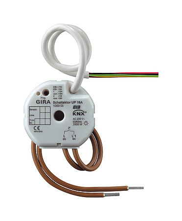KNX Schaltaktor 1fach 16 A Unterputz Merkmale: - Freie Zuordnung der Funktionen Schalten, Dimmen, Jalousie und Wertgeber zu den Eingängen. - Sperrobjekt zum Sperren einzelner Eingänge. - Verhalten bei Busspannungswiederkehr für jeden Eingang separat parametrierbar. - Telegrammratenbegrenzung. - Funktion Schalten: zwei unabhängige Schaltobjekte für jeden Eingang vorhanden und einzeln freischaltbar, Befehl bei steigender und fallender Flanke unabhängig einstellbar (EIN, AUS, UM, keine Reaktion). - Funktion Dimmen: Einflächen- und Zweiflächenbedienung, Zeit zwischen Dimmen und Schalten und Dimmschrittweite einstellbar, Telegramm-Wiederholung und Stopp-Telegramm senden möglich. - Funktion Jalousie: Befehl bei steigender Flanke einstellbar (keine Funktion, AUF, AB, UM), Bedienkonzept parametrierbar (Step - Move - Step bzw. Move - Step), Zeit zwischen Kurz- und Langzeitbetrieb einstellbar, Lamellenverstellzeit einstellbar. - Funktion Wertgeber und Lichtszenennebenstelle: Flanke (Taster als Schließer, Taster als Öffner, Schalter) und Wert bei Flanke parametrierbar, Wertverstellung bei Taster über langen Tastendruck für Wertgeber möglich, Lichtszenennebenstelle mit Speicherfunktion auch Speicherung der Szene ohne vorherigen Abruf möglich. - Schaltaktor 1fach Unterputz mit zwei Binäreingängen. An die zwei Binäreingänge können potenzialfreie Kontakte angeschlossen werden. Die beiden Eingänge können dabei unabhängig voneinander verschiedene Funktionen ausführen oder gesperrt werden. - Werkseitig ist der Eingang "1" dem Schaltaktor zugeordnet, so dass eine Bedienung ohne Programmierung möglich ist. - Ausgang als Schließer oder Öffner parametrierbar. - Auswahl der Vorzugslage bei Busspannungsausfall und -wiederkehr. - Ein- bzw. Ausschaltverzögerung oder Zeitschaltfunktion einstellbar. - Ausgang mit drei Objekten: Schalten, Rückmeldung und Zusatzfunktion (Verknüpfung, Sperrfunktion oder Zwangsstellung). - Rückmeldeobjekt invertierbar. Hinweise : - Zur Montage in Gerätedose (Empfehlung Elektronikdose der Firma Kaiser). Unterputz, Kaiser Best.-Nr.: 1068-02, Hohlwand, Kaiser Best.-Nr.: 9062-94, halogenfrei, Kaiser Best.-Nr.: 9062-74. - Der Anschluss der Ausgänge erfolgt über eine flexible ca. 20 cm lange Leitung. - Der Anschluss der Binäreingänge und des KNX Busses erfolgt über eine 6-adrige ca. 30 cm lange Anschlussleitung, die auf max. 5 m verlängert werden kann. - VDE-Zulassung gemäß EN 60669-1, EN 60669-2-1.| Hersteller / Marke | GIRA |