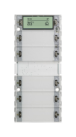 KNX Tastsensor 3 Plus 5fach (2+3) System 55, Gira E22 Inbetriebnahme-Wippe Merkmale: - Montage auf Busankoppler 3 oder Busankoppler 3 externer Fühler. - Demontageschutz durch Verschraubung. - Grafikdisplay mit Hintergrundbeleuchtung und vielfältigen Anzeigemöglichkeiten, z. B. Temperatur, Uhrzeit, Datum, Alarm- und Hinweistexte. - Zwei mehrfarbige Status-LEDs je Bedienfläche. - Mehrfarbige Status-LED (rot, grün, blau) über die ETS parametrierbar. - Beschriftungsfeldbeleuchtung bei Wippensets mit Beschriftungsfeld. - Interner Temperatursensor zum Messen der lokalen Raumtemperatur. Tastsensor-Eigenschaften:: - Wippen- oder Tastenfunktion für jede Bedienfläche einstellbar. - Wippenfunktion: Schalten, Dimmen, Jalousiesteuerung, Wertgeber 1 Byte, Wertgeber 2 Byte, Szenennebenstelle, 2-Kanal-Bedienung und manuelle Lüftersteuerung. - Tastenfunktion: Schalten, Dimmen, Jalousiesteuerung, Wertgeber 1 Byte, Wertgeber 2 Byte, Szenennebenstelle, 2-Kanal-Bedienung, Reglernebenstelle, Reglerbedienung, Heizungsuhrbedienung und manuelle Lüftersteuerung. - Reglernebenstelle oder Reglerbedienung: Betriebsmodusumschaltung, (definierte Wahl eines Betriebsmodus oder Wechsel zwischen verschiedenen Betriebsmodi bei Reglernebenstelle), Wechsel des Präsenzzustands, Sollwertverschiebung. - Sperrobjekt zum Sperren von einzelnen Tasten- bzw. Wippenfunktionen. - Anzeige einer Alarmmeldung durch Blinken sämtlicher LEDs. - Mehrfarbige Status-LED (rot, grün, blau) ist global oder jeweils getrennt konfigurierbar. Über den Bus kann eine überlagerte Funktion aktiviert werden, wodurch Farbe und Anzeigeinformation einzelner Status-LEDs prioritätsbedingt verändert werden können. - Beschriftungsfeldbeleuchtung EIN, AUS, automatische Abschaltung oder über Objekt schaltbar. - Kommunikationsobjekt zur Helligkeitssteuerung der Status-LED, Beschriftungsfeldbeleuchtung und Hintergrundbeleuchtung des Displays. Raumtemperaturregler-Eigenschaften:: - Betriebsmodi: Komfort, Stand-by, Nacht und Frost- bzw. Hitzeschutz mit jeweils eigenen Temperatursollwerten (für Heizen und bzw. oder Kühlen). - Komfortverlängerung durch Präsenztaste. - Frost- bzw. Hitzeschutzumschaltung durch Fensterstatus oder durch Frostschutzautomatik. - Anzeige der Raumtemperaturregler-Informationen über das Gerätedisplay. - Wahlweise ein oder zwei Regelkreise. - Je Heiz- oder Kühlstufe sind verschiedene Regelungsarten konfigurierbar: PI-Regelung (stetige oder schaltende PWM) oder 2-Punkt-Regelung (schaltend). - Regelparameter für PI-Regler und 2-Punkt-Regler einstellbar. - Interner Temperatursensor und bis zu zwei externe Temperaturfühler (1 x Objekt, 1 x bedrahtet) zur Raumtemperaturmessung möglich. - Optionaler externer bedrahteter Fernfühler bei Fußbodenheizung. - Heizungsuhr mit 28 Schaltzeiten. LC-Display Eigenschaften:: - Grafikdisplay mit schaltbarer LED-Hintergrundbeleuchtung. - 1-Bereichs- oder 2-Bereichsdarstellung. - Textanzeigen im Display in den Sprachen: Deutsch, Englisch, Niederländisch, Norwegisch, Russisch und Polnisch. Weitere Sprachen im Internet verfügbar. Hinweise : - Professionelle Beschriftung über den Gira Beschriftungsservice www.beschriftung.gira.de. - Der Tastsensor wird mit einer programmneutralen Inbetriebnahme-Wippe geliefert. Das passende Wippenset zum Schalterprogramm ist separat zu bestellen.