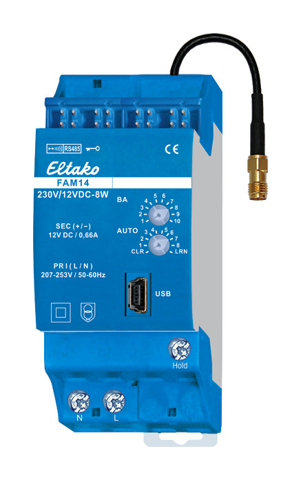 Funk-Antennenmodul für den Eltako-RS485-Bus mit austauschbarer Antenne. Mit integriertem Schaltnetzteil 12V DC/8W. Bidirektional. Verschlüsselter Funk. Stand-by-Verlust nur 1 Watt. Bei Bedarf kann eine Funkantenne FA250 oder FA200 angeschlossen werden. Reiheneinbaugerät für Montage auf Tragschiene. 36mm breit, 58mm tief. Versorgungsspannung 230V. Im Lieferumfang enthalten sind 1 Distanzstück DS14, 2 Abschlusswiderstände zum Aufstecken mit Aufdruck Ohm, 1/2 TE, 3 Steckbrücken 1 TE (davon 1 Ersatz), 1 Steckbrücke 1,5 TE, 2 Steckbrücken 1/2 TE (davon 1 Ersatz) und ein Steckbrücken-Montagewerkzeug SMW14. Das Funk-Antennenmodul FAM14 empfängt und prüft alle Signale der Funksender und Repeater in seinem Empfangsbereich. Diese werden über eine RS485-Schnittstelle an nachgeschaltete RS485-Bus-Schaltaktoren weitergegeben: Bis zu 126 Kanäle können an den RS485-Bus angeschlossen werden. Querverdrahtung Bus und Stromversorgung mit Steckbrücke. Am letzten Aktor muss der beiliegende zweite Abschlusswiderstand aufgesteckt werden. Es können bis zu 128 verschlüsselte Sensoren eingelernt werden. Mini-USB zum Anschluss eines PC zur Erstellung einer Geräteliste, zur Konfiguration der Aktoren mit Hilfe des PC-Tools PCT14 und zur Datensicherung. Ein Legalisierungs-Code für den Download des PCT14 von der Eltako-Homepage www.eltako.de liegt dem FAM14 bei. Bei einer Belastung größer 50% der Nennleistung von 8W ist auf der linken Seite eine halbe Teilungseinheit Lüftungsabstand mit dem Distanzstück DS14 erforderlich.