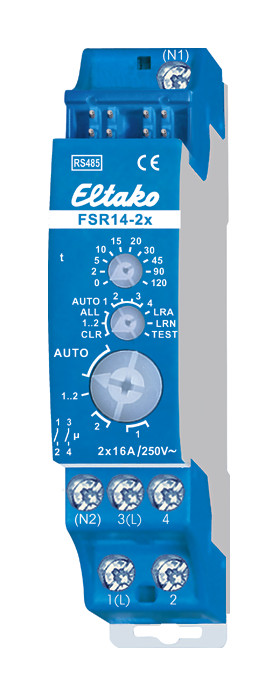 Stromstoß-Schaltrelais mit 2 Kanälen, 1+1 Schließer potenzialfrei 16A/250V AC, Glühlampen 2000W, mit DX-Technologie. Bidirektional. Stand-by-Verlust nur 0,1 Watt. Reiheneinbaugerät für Montage auf Tragschiene. Anschluss an den Eltako-RS485-Bus. Querverdrahtung Bus und Stromversorgung mit Steckbrücke. Hierzu einfach den N-Leiter an die Klemme (N1) und L an 1(L) und/oder N an (N2) und L an 3(L) anschließen. Dadurch ergibt sich ein zusätzlicher Stand-by-Verlust von nur 0,1 Watt. Beim Ausfall der Versorgungsspannung bleibt der Schaltzustand erhalten. Bei wiederkehrender Versorgungsspannung wird definiert ausgeschaltet. Die Kanäle können unabhängig voneinander als ES- und/oder ER-Kanal eingelernt werden. Szenen-Steuerung: Mit einem der vier Steuersignale eines als Szenentaster eingelernten Tasters mit Doppelwippe können mehrere Kanäle eines oder mehrerer FSR14-2x zu je einer Szene ein- bzw. ausgeschaltet werden. Zentralbefehle am PC werden mit der Gebäudefunk-Visualisierungs- und Steuerungs-Software GFVS gesendet. Die LED unter dem oberen Drehschalter begleitet den Einlernvorgang gemäß Bedienungsanleitung und zeigt im Betrieb Steuerbefehle durch kurzes Aufblinken an.