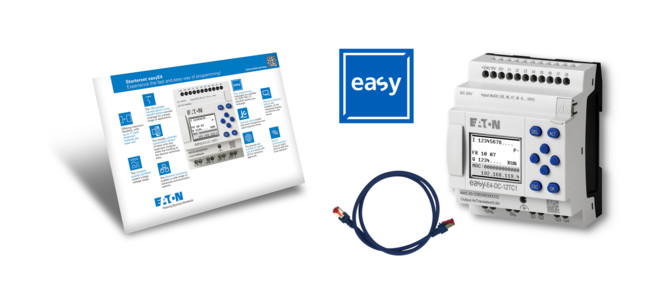 Starterpaket zum leichten Einstieg in die Steuerungstechnik. Das Starterpaket enthält das Steuerrelais EASY-E4-DC-12TC1 mit LCD-Display und Anschlüsse per Schraubklemme, eine Patch-Leitung zum Anschluss des Steuerrelais an die Ethernet-Schnittstelle und eine Lizenz für die Bedien- und Programmiersoftware easySoft.| Hersteller / Marke | EATON |