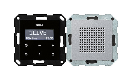 Unterputz-Radio RDS mit einem Lautsprecher Bedienaufsatz in Schwarzglasoptik Farbe Alu Merkmale: - UKW-Radio mit RDS-Anzeige zur Unterputz-Montage. - Das Unterputz-Radio RDS besteht aus einem Einsatz Radio mit Bedienaufsatz und einem Einsatz Lautsprecher mit Abdeckung. - Der Einsatz Radio ist kompakt in einem Unterputz-Einsatz untergebracht und kann somit in eine einzelne Gerätedose installiert werden. - Der Lautsprecher kann mit dem Einsatz Radio in einer Kombination oder auch abgesetzt in eine Gerätedose installiert werden. An den Einsatz Radio können zwei Lautsprecher angeschlossen werden. - Das Radio erkennt angeschlossene Lautsprecher automatisch und schaltet zwischen Stereo- und Monobetrieb um. - Das Display des Bedienaufsatzes zeigt bei einem entsprechenden RDS-Signal den Sendernamen, die Sendefrequenz und die Uhrzeit an. - Die Bedienung des Radios erfolgt über die kapazitiven Tasten des Bedienaufsatzes. Zur Bedienung ist lediglich eine leichte Berührung der Symbole notwendig. - Das Unterputz-Radio RDS verfügt über zwei Speicherplätze, auf denen je ein Sender einfach per Tastenbetätigung gespeichert und abgerufen werden kann. - Über den Nebenstelleneingang kann das Radio z. B. mit einem Lichtschalter oder einem Automatikschalter zusammen mit der Raumbeleuchtung eingeschaltet werden. - Über den Stereo-AUX-Eingang des Radios können externe Audioquellen, z. B. MP3-Player, in das Radio eingespeist werden. Zum Anschluss der externen Audioquelle wird zusätzlich ein Einsatz Cinch-Audio benötigt, welcher an die AUX-Klemmen des Einsatzes Radio angeschlossen wird. - Der Einsatz Dockingstation wird zur Musikwiedergabe direkt an den Stereo-AUX-Eingang angeschlossen. - Im Sleep-Modus schaltet das Radio 30 Minuten nach dem Einschalten automatisch wieder aus. Hinweise : - In Kombination mit weiteren elektronischen Geräten unter einer gemeinsamen Abdeckung kann es zu Empfangsbeeinträchtigungen kommen.| Hersteller / Marke | GIRA |