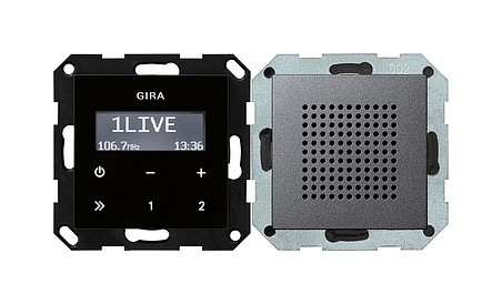 Unterputz-Radio RDS mit einem Lautsprecher Bedienaufsatz in Schwarzglasoptik Anthrazit Merkmale: - UKW-Radio mit RDS-Anzeige zur Unterputz-Montage. - Das Unterputz-Radio RDS besteht aus einem Einsatz Radio mit Bedienaufsatz und einem Einsatz Lautsprecher mit Abdeckung. - Der Einsatz Radio ist kompakt in einem Unterputz-Einsatz untergebracht und kann somit in eine einzelne Gerätedose installiert werden. - Der Lautsprecher kann mit dem Einsatz Radio in einer Kombination oder auch abgesetzt in eine Gerätedose installiert werden. An den Einsatz Radio können zwei Lautsprecher angeschlossen werden. - Das Radio erkennt angeschlossene Lautsprecher automatisch und schaltet zwischen Stereo- und Monobetrieb um. - Das Display des Bedienaufsatzes zeigt bei einem entsprechenden RDS-Signal den Sendernamen, die Sendefrequenz und die Uhrzeit an. - Die Bedienung des Radios erfolgt über die kapazitiven Tasten des Bedienaufsatzes. Zur Bedienung ist lediglich eine leichte Berührung der Symbole notwendig. - Das Unterputz-Radio RDS verfügt über zwei Speicherplätze, auf denen je ein Sender einfach per Tastenbetätigung gespeichert und abgerufen werden kann. - Über den Nebenstelleneingang kann das Radio z. B. mit einem Lichtschalter oder einem Automatikschalter zusammen mit der Raumbeleuchtung eingeschaltet werden. - Über den Stereo-AUX-Eingang des Radios können externe Audioquellen, z. B. MP3-Player, in das Radio eingespeist werden. Zum Anschluss der externen Audioquelle wird zusätzlich ein Einsatz Cinch-Audio benötigt, welcher an die AUX-Klemmen des Einsatzes Radio angeschlossen wird. - Der Einsatz Dockingstation wird zur Musikwiedergabe direkt an den Stereo-AUX-Eingang angeschlossen. - Im Sleep-Modus schaltet das Radio 30 Minuten nach dem Einschalten automatisch wieder aus. Hinweise : - In Kombination mit weiteren elektronischen Geräten unter einer gemeinsamen Abdeckung kann es zu Empfangsbeeinträchtigungen kommen.
