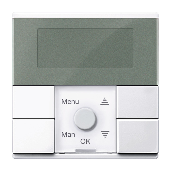 Für System M. Zum programmierten und zeitabhängigen Schalten von Verbrauchern wie Jalousie-/Rollladenmotorenxx Anzahl der Schaltspiele (hoch/runterfahren): Jalousie-Einsätze: -Pro Kanal: 2 Schaltspiele / Tag. Zentralstellen-Einsatz: -Pro PL-Linie: 2 Schaltspiele / Tag. Funktionen: -Voreingestellte Schaltzeiten (in freien Gruppen). Menügeführte Bedienung: -Gangreserve >6 Stunden. Reset zum Rücksetzen auf Werkseinstellung. Zuschaltbarer Zufallsgenerator (im Bereich 0-30 min). Astrofunktion. Einfache Umschaltung Sommer / Winterzeit. Individuelle Laufzeit programmierbar. Manuelle Betätigung jederzeit möglich. Wählbare Pfeiltastenfunktion für Tasten oder globale Szenen. Helligkeitswerte für Sonnenschutzfunktion einstellbar. Verhalten bei Windalarm einstellbar. Lokal Jalousien/Rollladen steuern: -Jalousiesteuerungs-Einsatz. Global Jalousien/Rollladen steuern, Szenen aufrufen: -Zentralstellen-Einsatz. Bedienelemente: 5 Tasten. Anzeigeelemente: 5 LED, LCD-Anzeige. Anschluss: Modul-Schnittstelle. Zu komplettieren mit: Zentralstellen-Einsatz MEG5190-0000. Elektronik-Schalt-Einsatz MEG5151-0000. Elektronik-Schalt-Einsatz, 2fach MEG5152-0000. Relais-Schalt-Einsatz MEG5161-0000. Relais-Schalt-Einsatz, 2fach MEG5162-0000. Jalousiesteuerungs-Einsatz MEG5165-0000. Universal-Dimmer-Einsatz MEG5171-0000. Universal-Dimmer-Einsatz, 2fach MEG5172-0000. Steuerungs-Einsatz 1-10 V MEG5180-0000. DALI-Steuerungs-Einsatz MEG5185-0000. Material: Thermoplast brillant, antibakteriell. Glatte und selbstdesinfizierende Oberfläche mit antibakterieller Wirkung. Farbe: ähnlich RAL 9016. Farbe: aktivweiß glänzend.
