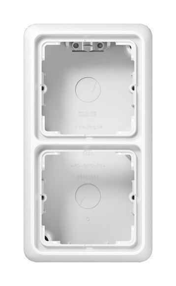 Aufputz-Kappe, 2fach, mit integrierter, flammwidriger Bodenplatte und angeformtem Rahmen, zum Einbau von Unterputz-Geräten mit ST-550-Zentralplatten und CD-500-Abdeckungen| Hersteller / Marke | JUNG |