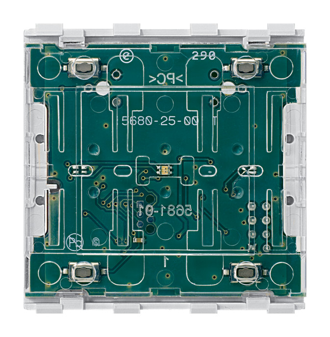 Für System M. Taster-Modul ohne Wippe. Das Taster-Modul wird auf den gewünschten Einsatz mit Modul-Schnittstelle aufgesteckt und mit der Wippe für Taster-Modul 1fach des passenden Designs komplettiert. Fernbedienbar und programmierbar über die Wiser Room App. Sie können über die App Einstellungen vornehmen und zusätzliche Funktionen nutzen, wie z. B. Timer (Treppenlicht). Zeitschaltuhr. Zufallsfunktion. Impulsgeber. Memoryfunktion. Minimale/maximale Helligkeit. Magnetkontakt. Sonnenschutzfunktion. Orientierungslicht. Funktionen Lokal schalten, Zeitschaltuhr, Zufallsfunktion, Timer mit/ohne Vorwarnung, Impulsgeber -Elektronik-Schalt-Einsatz. Relais-Schalt-Einsatz. Elektronik-Schalt-Einsatz, 2fach (beide Kanäle gleichzeitig). Relais-Schalt-Einsatz, 2fach (beide Kanäle gleichzeitig). Lokal schalten/ dimmen, Zeitschaltuhr, Zufallsfunktion, Timer mit/ohne Vorwarnung -Universal-Dimmer-Einsatz. Universal-Dimmer-Einsatz, 2fach (beide Kanäle gleichzeitig). Steuerungs-Einsatz 1-10 V. DALI-Steuerungs-Einsatz. Lokal Jalousien/ Rollladen steuern, Zeitschaltuhr, Zufallsfunktion, Sonnenschutz-Funktion -Jalousiesteuerungs-Einsatz. Global schalten, dimmen, Jalousie/Rollladen steuern, Zeitschaltuhr, Zufallsfunktion -Zentralstellen-Einsatz. Bedienelemente 2 Tasten. Anzeigeelemente 1 Status-LED, 1 Orientierungs-LED. Anschluss Modul-Schnittstelle. Zu komplettieren mit Zentralstellen-Einsatz MEG5190-0000. Elektronik-Schalt-Einsatz MEG5151-0000. Elektronik-Schalt-Einsatz, 2fach MEG5152-0000. Relais-Schalt-Einsatz MEG5161-0000. Relais-Schalt-Einsatz, 2fach MEG5162-0000. Jalousiesteuerungs-Einsatz MEG5165-0000. Universal-Dimmer-Einsatz MEG5171-0000. Universal-Dimmer-Einsatz, 2fach MEG5172-0000. Steuerungs-Einsatz 1-10 V MEG5180-0000. DALI-Steuerungs-Einsatz MEG5185-0000. Zu komplettieren mit Wippe für Taster-Modul 1fach System M MEG5210-03xx/-04xx Wippe für Taster-Modul 1fach (1/0) System M MEG5211-03xx/-04xx Wippe für Taster-Modul 1fach (Pfeile Auf/Ab) System M MEG5215-03xx/-04xx. Hinweis Steuerbar über Bluetooth (Verfügbar bei Geräten mit Bluetooth Smart Ready ab V4.1). Die APP Wiser Roomist lauffähig auf Geräten ab AndroidTM 4.4 und Apple iOS9.1.