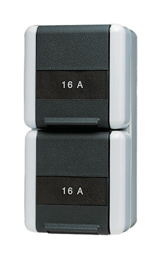SCHUKO-Steckdose, 2fach, 16 A, 250 V ~, mit 2 Schriftfeldern 22 x 48 mm, verdrahtet, 2 Leitungseinführungen, Abmessungen (B x H x T): 75 x 151 x 58 mm, für senkrechte Montage