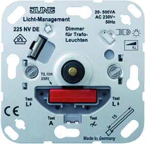 NV Drehdimmer  NV-Drehdimmer (Softrastung) — mit Druck-Wechselschalter — 20 bis 500 W/VA einschließlich ca. 5 % Trafo-Verlustleistung — für NV-Lampen mit konventionellen Trafos (Phasenanschnitt) und 230-V-Glüh- und -Halogenlampen — mit 4. Klemme geeignet zum Anschluss an Netzfreischaltgeräte mit entsprechendem Grundlastwiderstand — Leistungszusatz dazu: 245 NL REG oder 246 EB