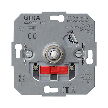 LED-Dimmeinsatz mit Dreh-Ausschalter 20 - 200 W Merkmale: - Schalten und Dimmen von Glühlampen, HV-Halogenlampen und phasenanschnittdimmbaren HV-LED-Lampen. - Kurzschlussschutz mit Feinsicherung. - Mit Schraubklemmen. Hinweise : - Bei höherer Umgebungstemperatur als 25 C ist die angeschlossene Last zu reduzieren.| Hersteller / Marke | GIRA |