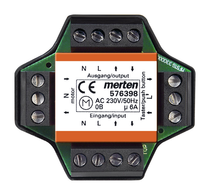 Passend für eine 60er-UP-Dose. Flache Bauform von 22 mm. Bei Vor-Ort-Steuerung mittels Taster Einbau in eine tiefe Unterputz-Dose. Zur Steuerung von bis zu 2 Rollladenmotoren vor Ort, in Gruppen oder zentral. Mit Trennung von Last- und Steuerkreis sowie Zwangsverriegelung in beiden Laufrichtungenxx Einzelbedienung der Motoren erfolgt über einen Rollladen-Wipptaster, zentrale Steuerungen über Jalousie-Zeitschaltuhren oder Jalousie-Taster des Merten-Jalousiesteuerungssystems. Netzspannung: AC 230 V, 50 Hz +/-10%. Steuerspannung: AC 230 V +/-10%. Stromaufnahme: 10 mA im Relaisbetrieb. Schaltspannung: max. AC 250 V. Schaltstrom: max. 2 A. Temperaturbereich: 0-60 GradC. Klemmen: max. 1,5 mm². Maße: 22x49x52 mm (HxBxT). Einbau: (tiefe) Unterputzdose. Zu komplettieren mit: Blindabdeckung System M 3916-, 3918xx, 3917xx, System Design MEG4075-60xx, System Fläche 3919xx