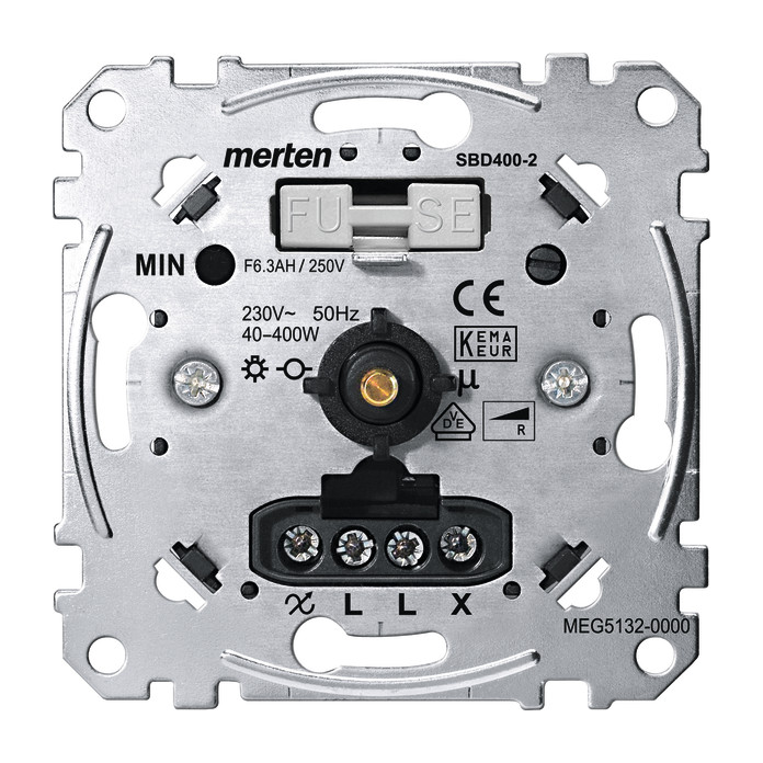 Für Glühlampen und 230 V-Halogenlampen. (Phasenanschnitt). Mit Druck-Wechselschalter. Zu komplettieren mit: Zentralplatte mit Drehknopf System M MEG5250-03xx/-04xx/-06xx Zentralplatte mit transparenter Abdeckung und Drehknopf M-Creativ MEG5250-3500. Zentralplatte mit Drehknopf System Design MEG5250-60xx, System Fläche MEG5250-40xx/-41xx/-42xx Hinweis: Informationen zum Thema Dimmen von LED Leuchtmittelnerhalten Sie im Internet unter Merten Dimmertest. http://www.merten.de/Dimmer-Test.dimmertest.0.html. Ausführung: 40-400 W.| Hersteller / Marke | MERTEN |