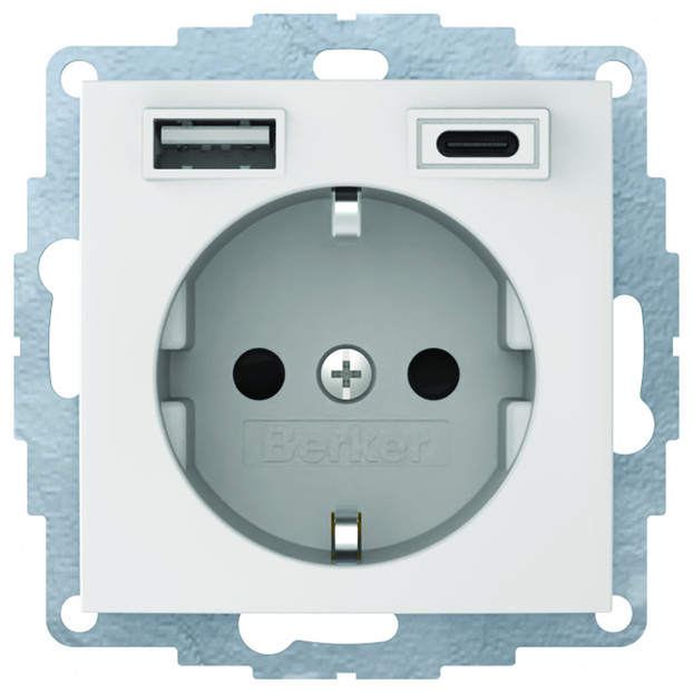 Steckdose SCHUKO/USB A-C S.1, polarweiß matt. Steckdose mit 2 USB-Buchsen Typ A und Typ C zum Laden mobiler Endgeräte, wie z.B. Tablets, Smartphones, Navigationsgeräte und Digitalkameras über USB-Kabel, kurzschlussfest und überlastsicher (elektronische Sicherung), für Unterputz- und Hohlwandmontage, mit Steckklemmen.