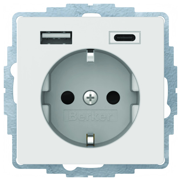 Steckdose SCHUKO/USB A-C Q.1/Q.3, polarweiß samt. Steckdose mit 2 USB-Buchsen Typ A und Typ C zum Laden mobiler Endgeräte, wie z.B. Tablets, Smartphones, Navigationsgeräte und Digitalkameras über USB-Kabel, kurzschlussfest und überlastsicher (elektronische Sicherung), für Unterputz- und Hohlwandmontage, mit Steckklemmen.