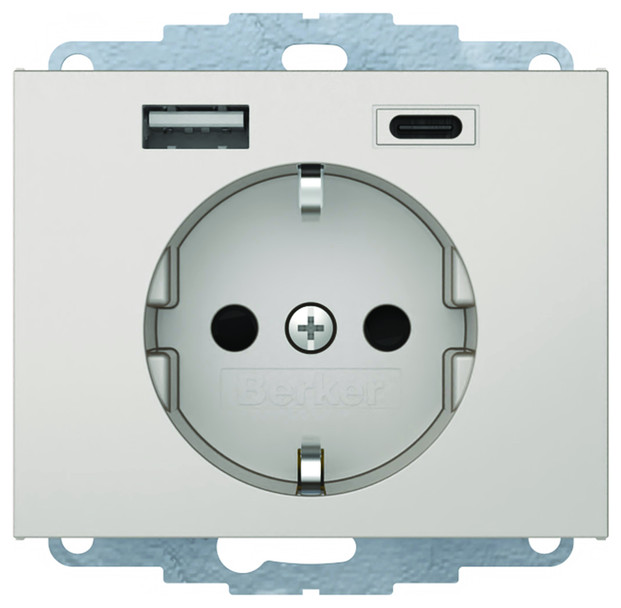 Steckdose SCHUKO/USB A-C K.x, edelstahl matt, lackiert. Steckdose mit 2 USB-Buchsen Typ A und Typ C zum Laden mobiler Endgeräte, wie z.B. Tablets, Smartphones, Navigationsgeräte und Digitalkameras über USB-Kabel, kurzschlussfest und überlastsicher (elektronische Sicherung), für Unterputz- und Hohlwandmontage, mit Steckklemmen.
