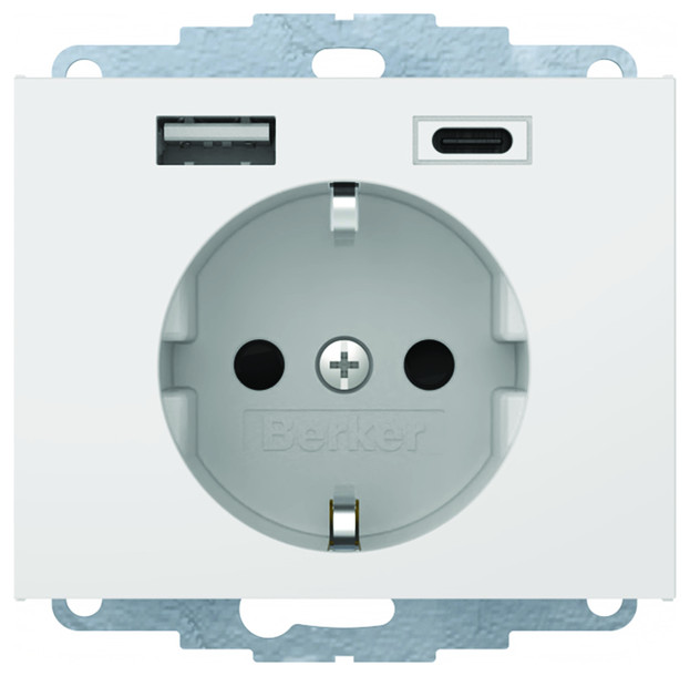 Steckdose SCHUKO/USB A-C K.x, polarweiß glänzend. Steckdose mit 2 USB-Buchsen Typ A und Typ C zum Laden mobiler Endgeräte, wie z.B. Tablets, Smartphones, Navigationsgeräte und Digitalkameras über USB-Kabel, kurzschlussfest und überlastsicher (elektronische Sicherung), für Unterputz- und Hohlwandmontage, mit Steckklemmen.