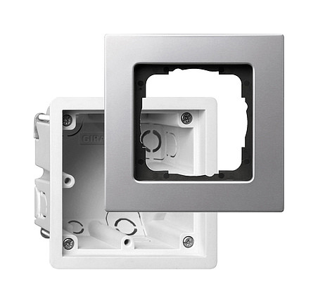 Einbauset Gira E22 für den flachen Einbau mit Abdeckrahmen und Gerätedose Aluminium 1fach Merkmale: - Hohlwandmontage durch Befestigung der Gerätedose Gira E22 wie bei einer marktüblichen Hohlwanddose. - Mauerwerkmontage durch Befestigung der optionalen Unterputz-Einbaudose Gira E22 , z. B. fixieren mit Gips. Montage der Gerätedose Gira E22 in der Unterputz-Einbaudose Gira E22 wie bei einer marktüblichen Hohlwanddose. Hinweise : - Die Gerätedose besitzt keine Leitungsrückhaltung.